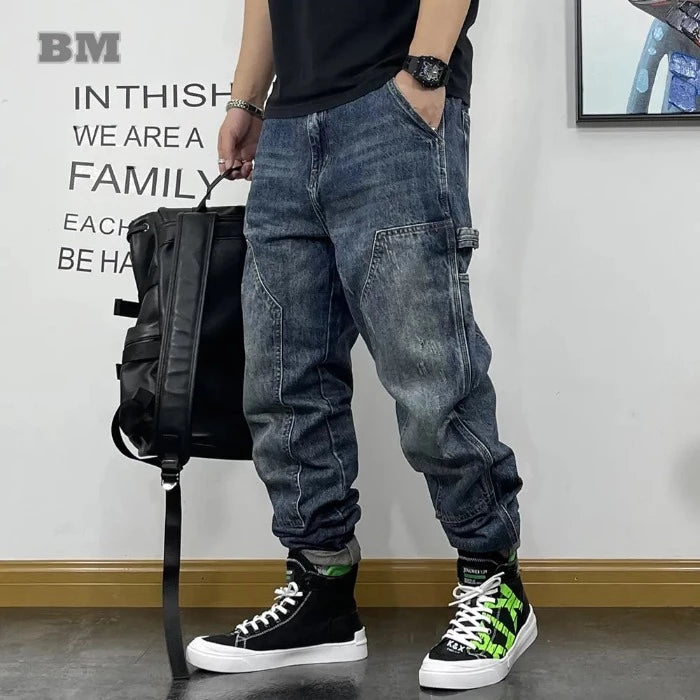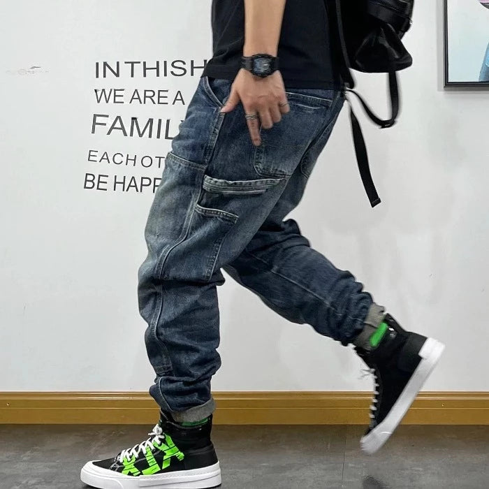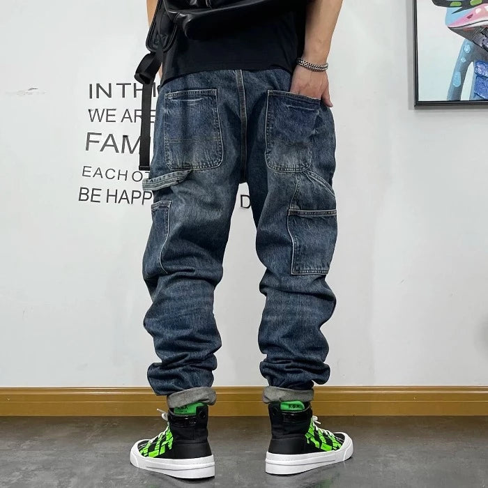 Tauchen Sie ein in den einzigartigen und trendigen Look der Jeans Cargo für Herren im angesagten Hip-Hop-Stil. Unsere Mode im amerikanischen Design präsentiert sich in einem leichten, leicht abgenutzten Blauton, der Ihren Style perfekt unterstreicht. Die kleinen Seitentaschen verleihen dieser Jeans eine praktische Note und setzen gleichzeitig ein stylisches Statement. Entdecken Sie den urbanen Chic und die Unverwechselbarkeit dieser Cargo-Jeans – ein Must-have für jeden Mann, der sich von der Masse abheben möchte!
