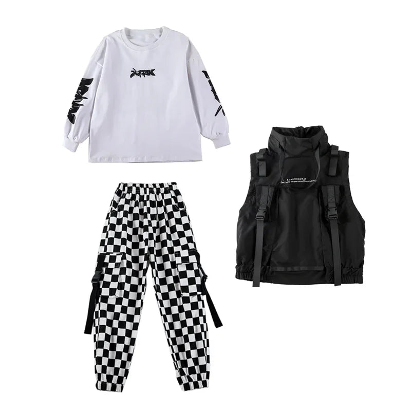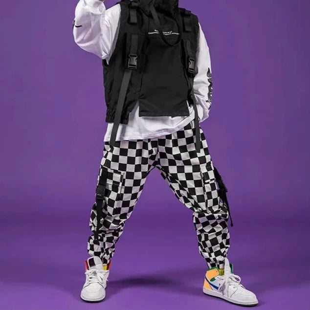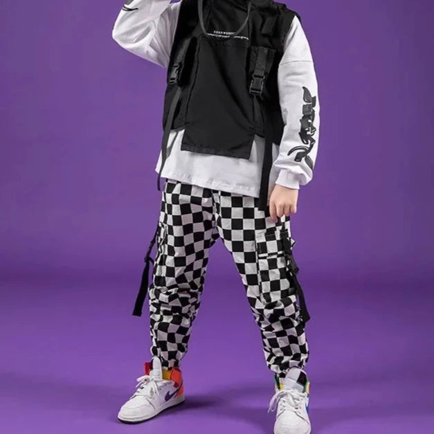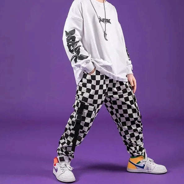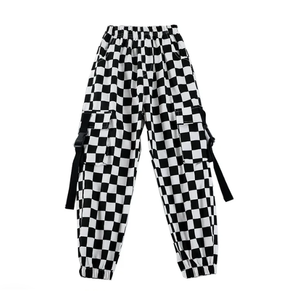 Karierte Cargohosen für einen Hip-Hop- und bequemen Look, absolut am Puls der Zeit. Diese sehr praktische schwarz-weiße Cargohose für Mädchen ist flexibel und passt sich allen Körpertypen an.