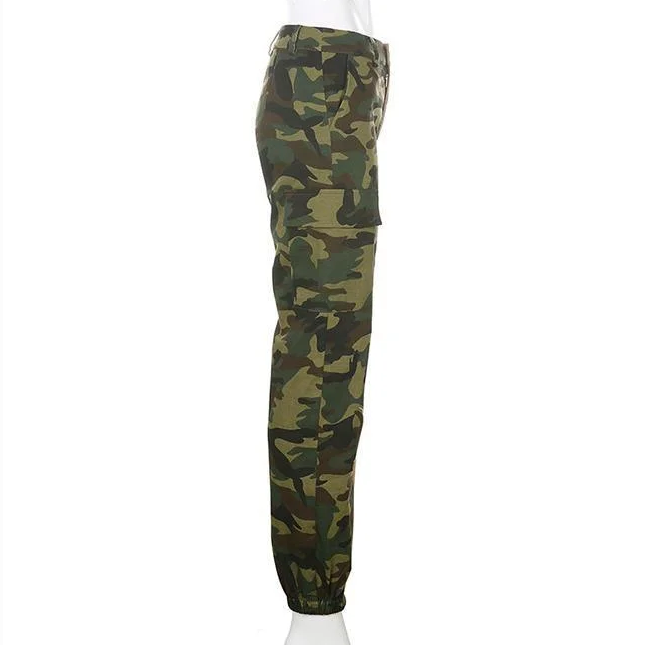 Art Streetwear: Camouflage-Cargohose für Damen, betonte Taille und trendiger Knöchelschnitt.